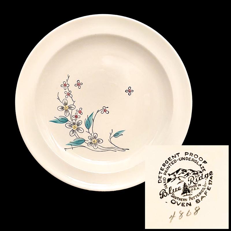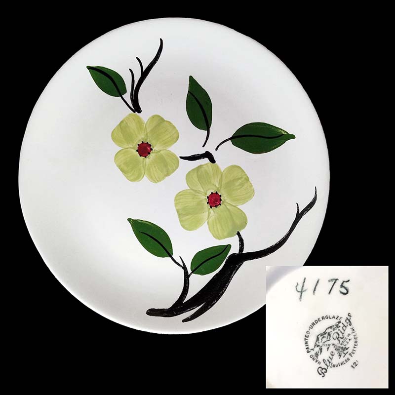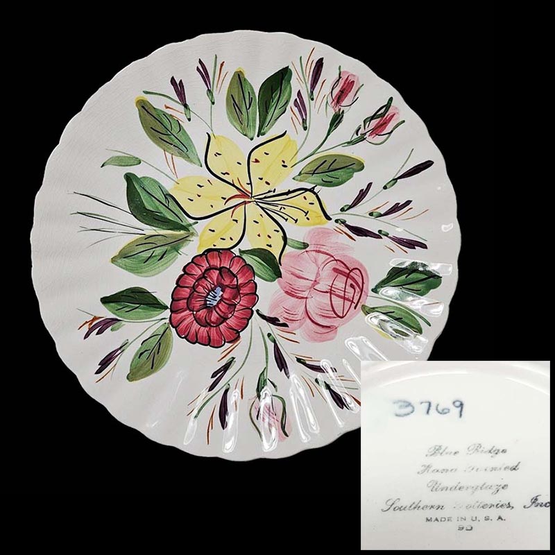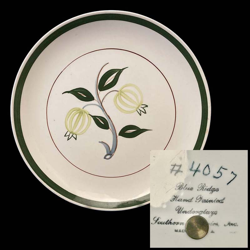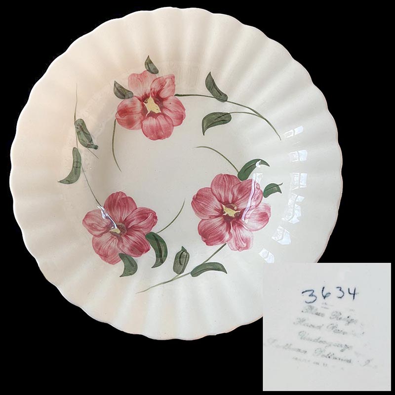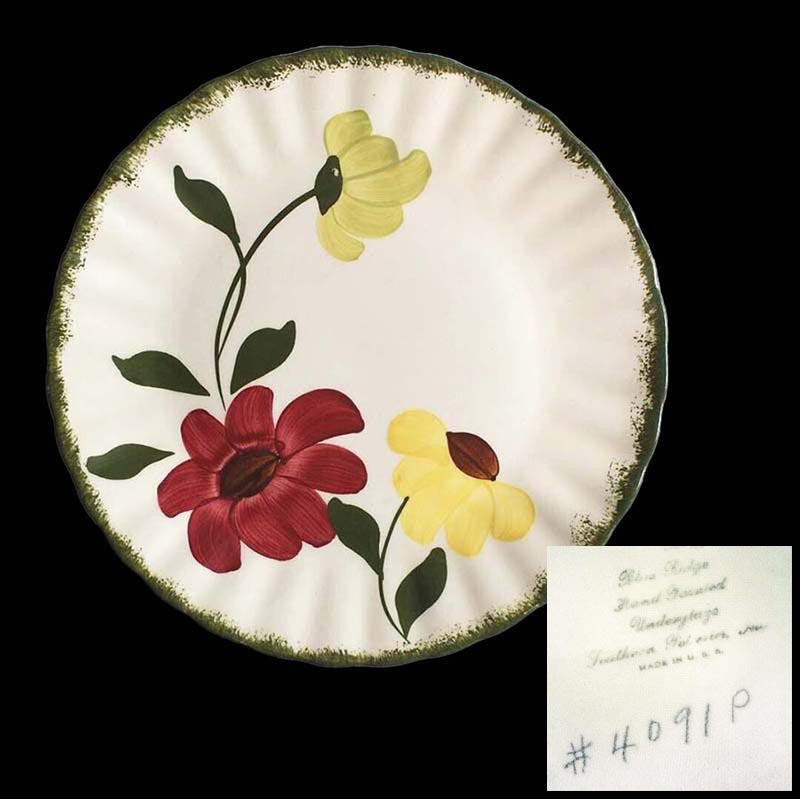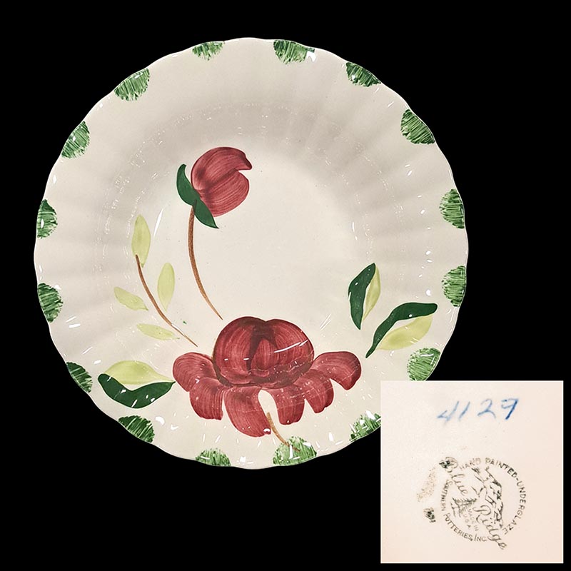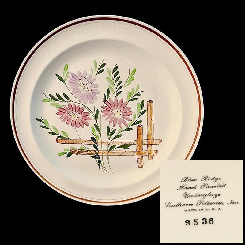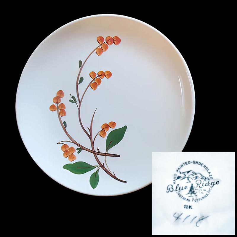 In general, these pattern names are based on the names given in John and Frances Ruffin's three books, Blue Ridge China Today, Blue Ridge China Traditions, and Blue Ridge China Treasures.My intention is to add as many pictures as possible to aid those who don't have access to any of the various Blue Ridge books, but I'll need some help to do it. If you have any pieces of a pattern for which a picture isn't shown, you can help others by sending a picture (a dinner plate works best). Also, if you have a pattern (and number) that is not shown on this page, that information would be greatly appreciated as well.