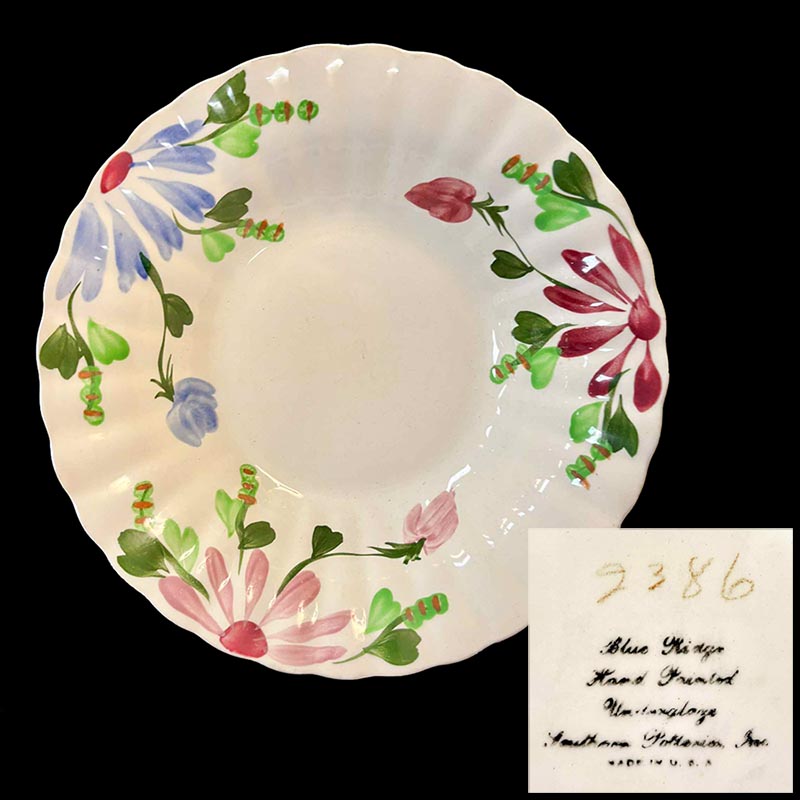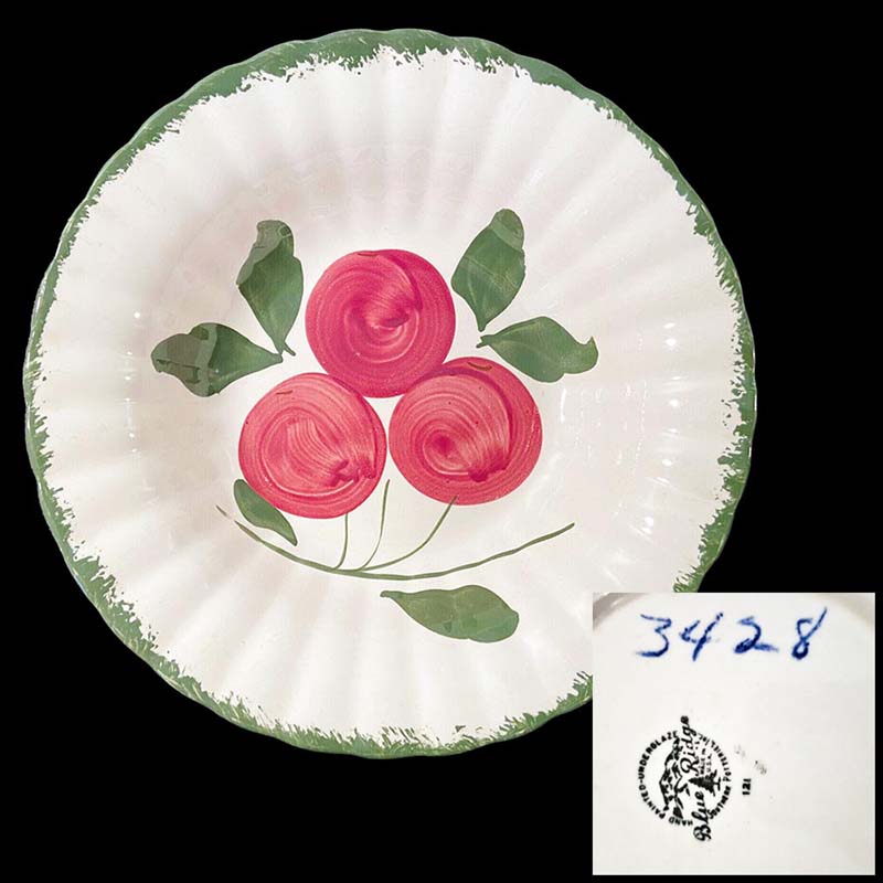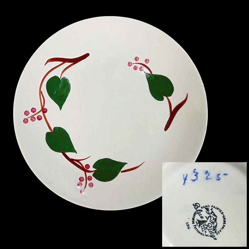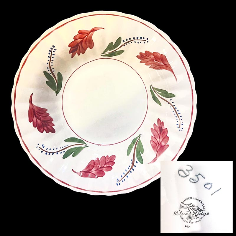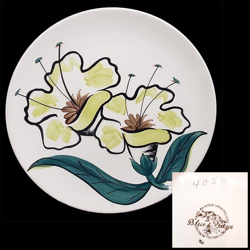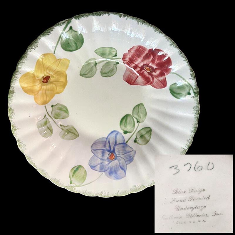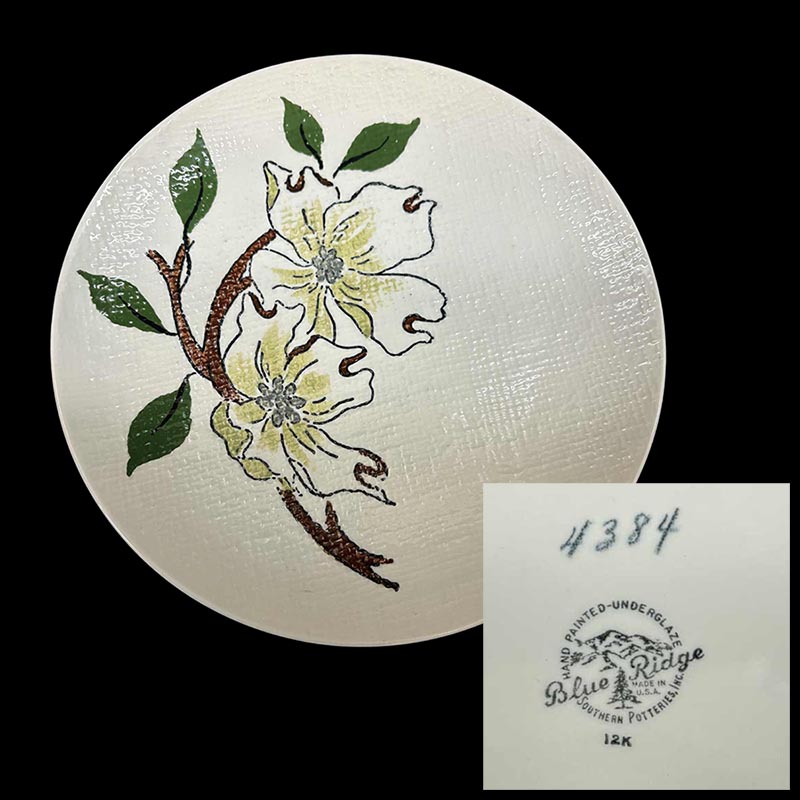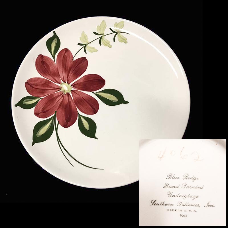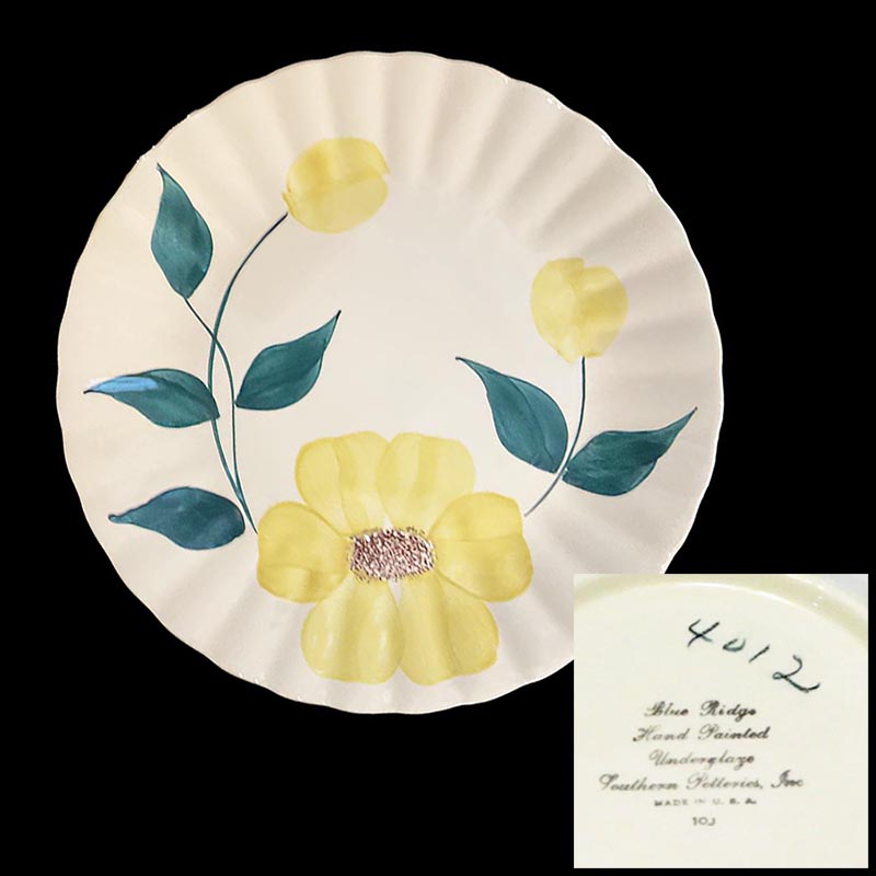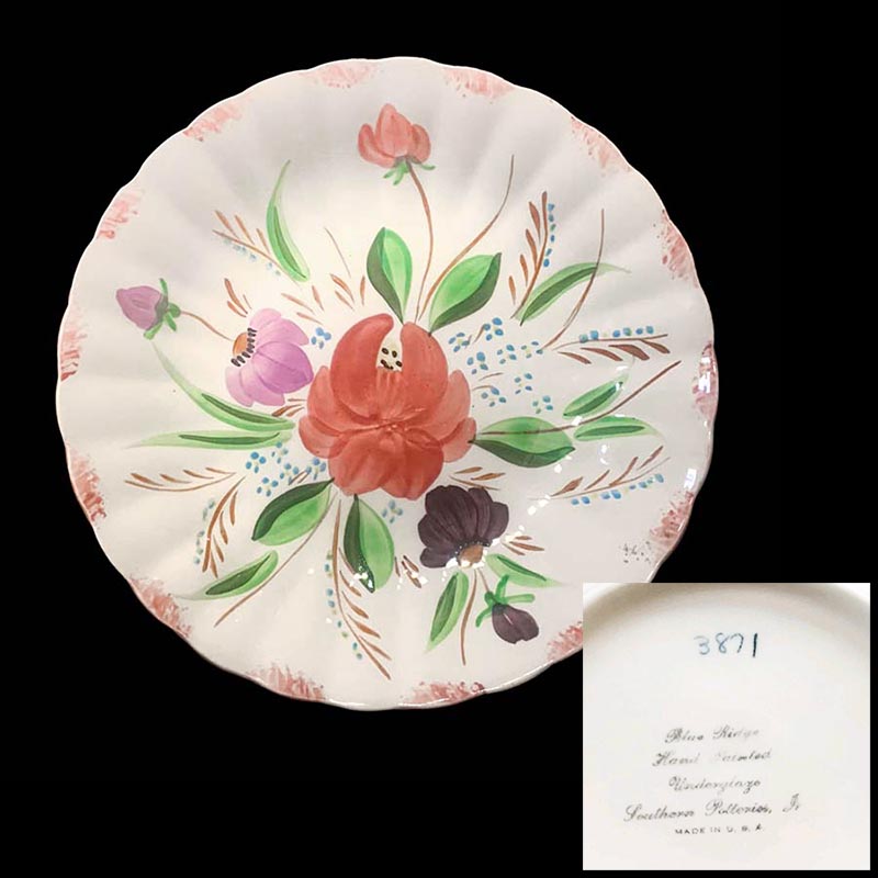 In general, these pattern names are based on the names given in John and Frances Ruffin's three books, Blue Ridge China Today, Blue Ridge China Traditions, and Blue Ridge China Treasures.My intention is to add as many pictures as possible to aid those who don't have access to any of the various Blue Ridge books, but I'll need some help to do it. If you have any pieces of a pattern for which a picture isn't shown, you can help others by sending a picture (a dinner plate works best). Also, if you have a pattern (and number) that is not shown on this page, that information would be greatly appreciated as well.