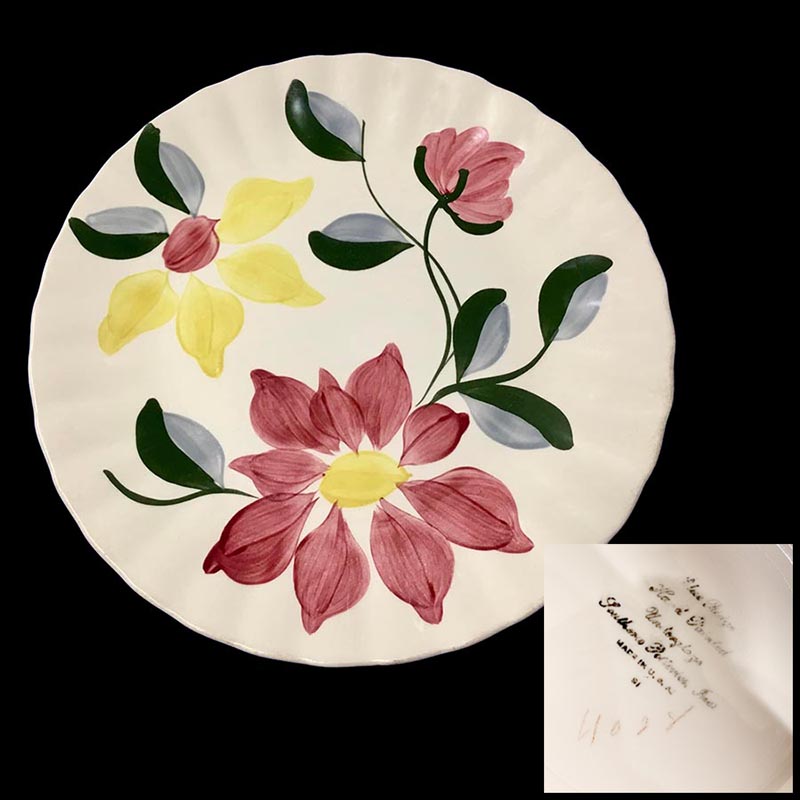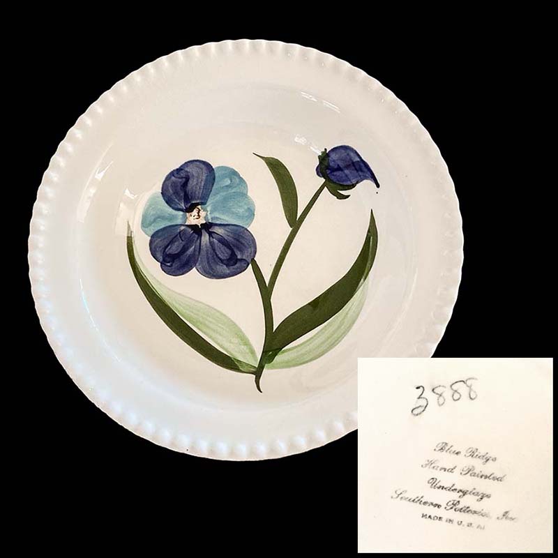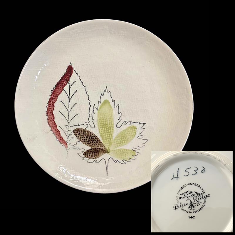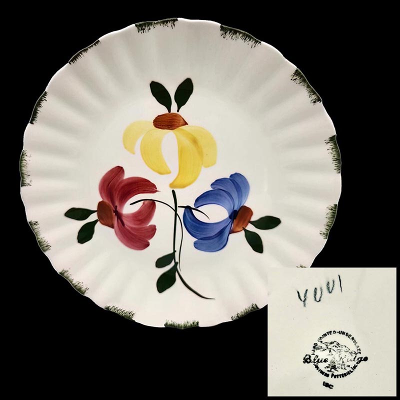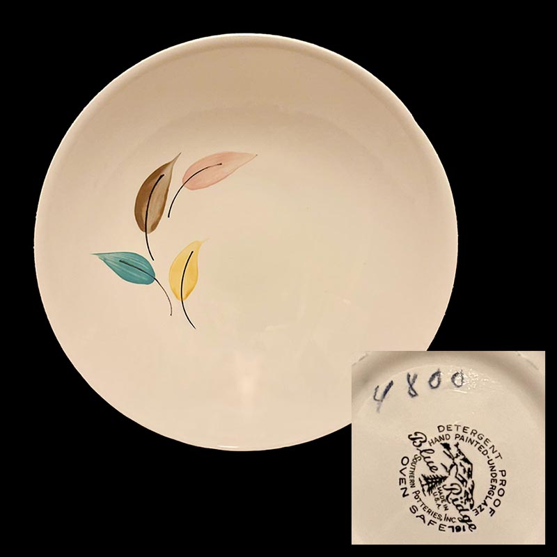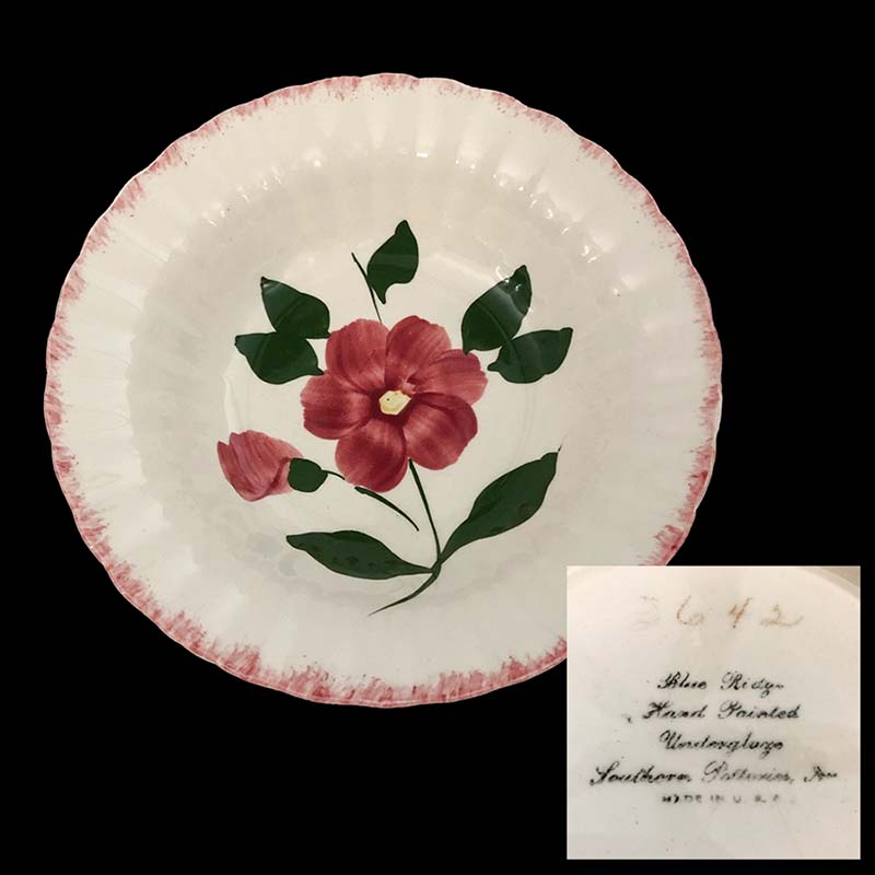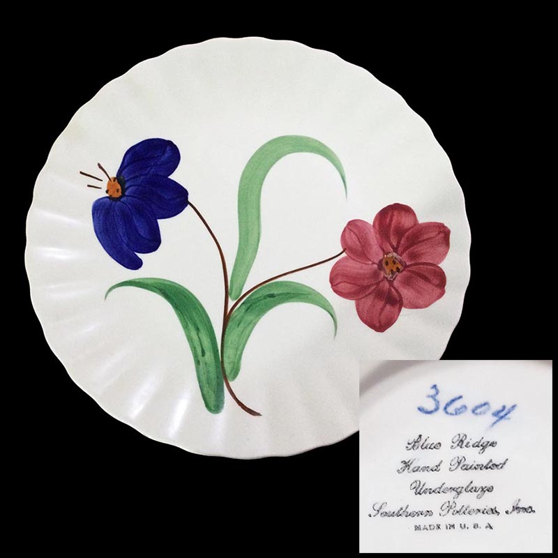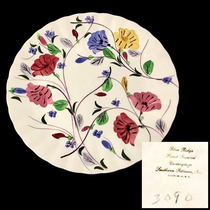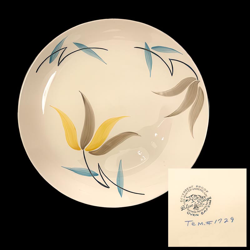 In general, these pattern names are based on the names given in John and Frances Ruffin's three books, Blue Ridge China Today, Blue Ridge China Traditions, and Blue Ridge China Treasures.My intention is to add as many pictures as possible to aid those who don't have access to any of the various Blue Ridge books, but I'll need some help to do it. If you have any pieces of a pattern for which a picture isn't shown, you can help others by sending a picture (a dinner plate works best). Also, if you have a pattern (and number) that is not shown on this page, that information would be greatly appreciated as well.