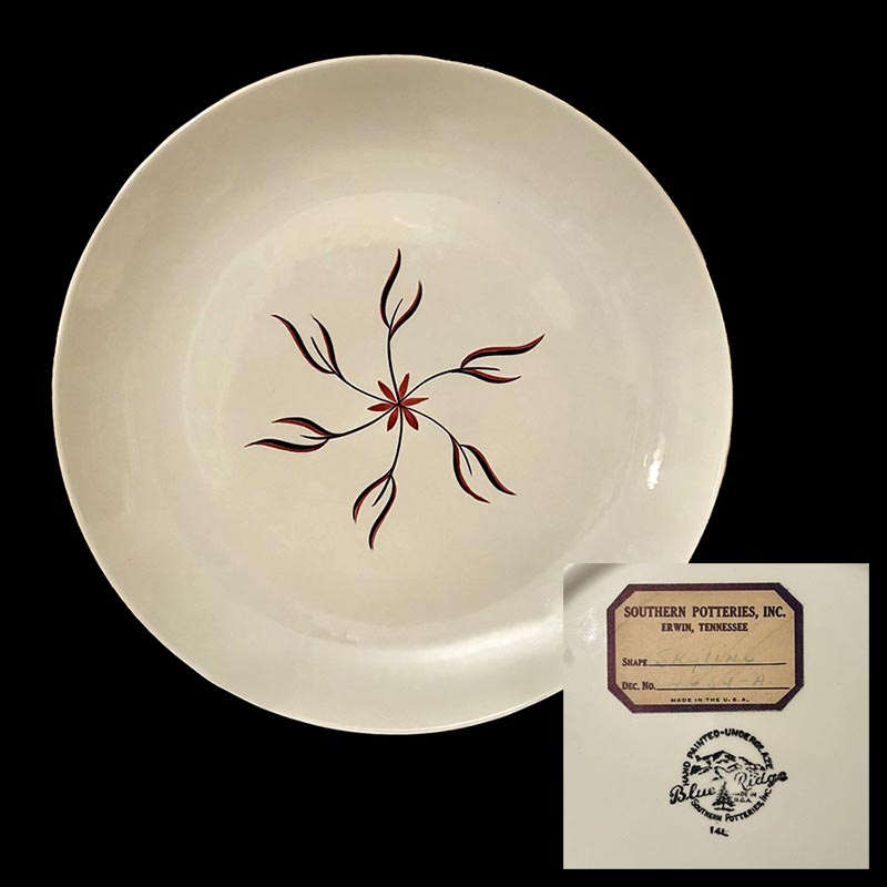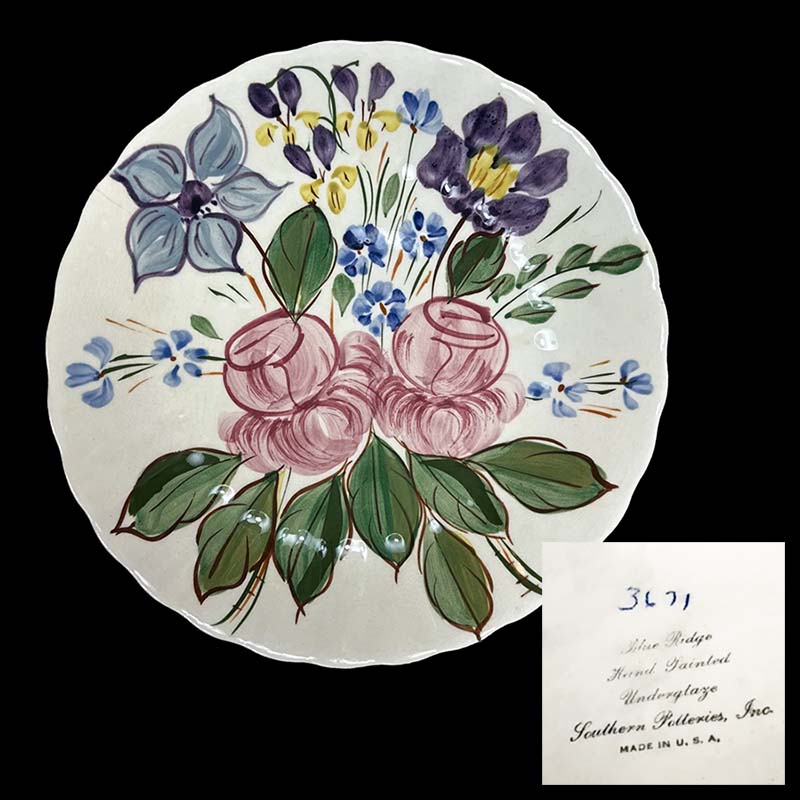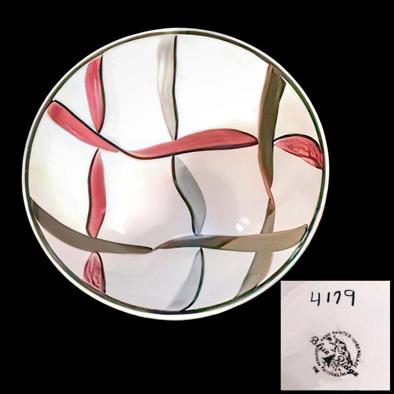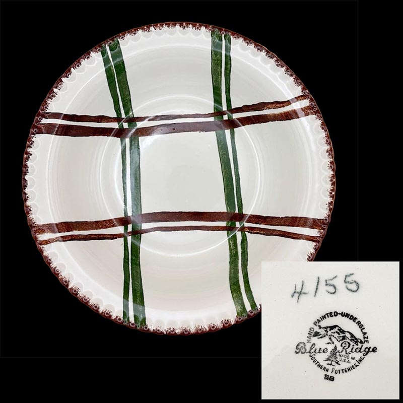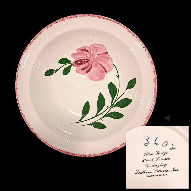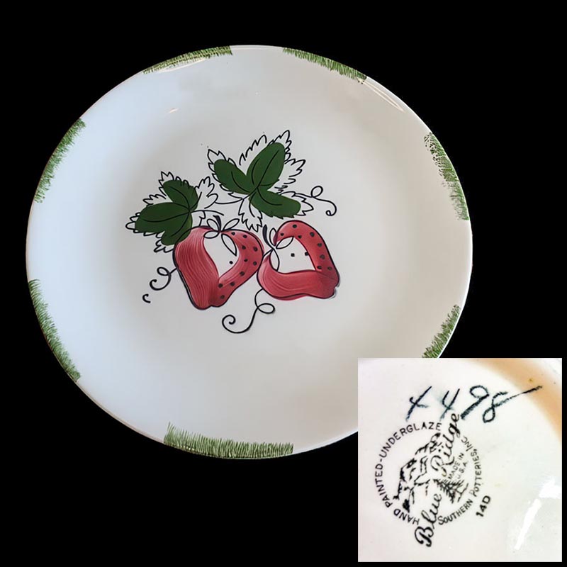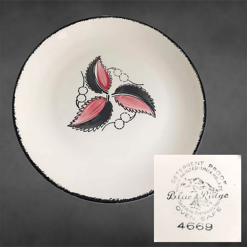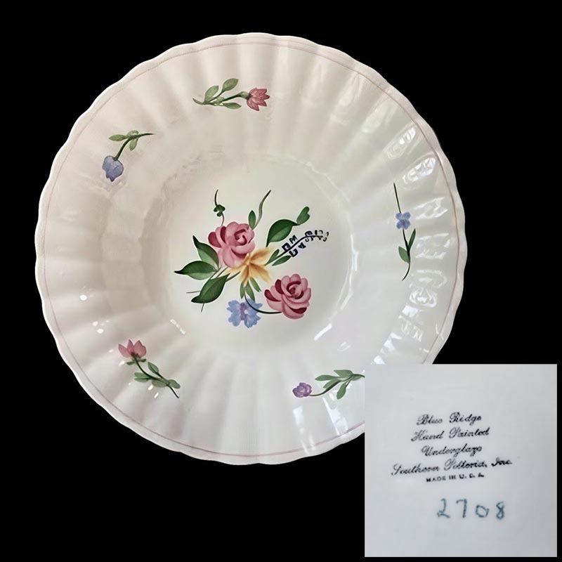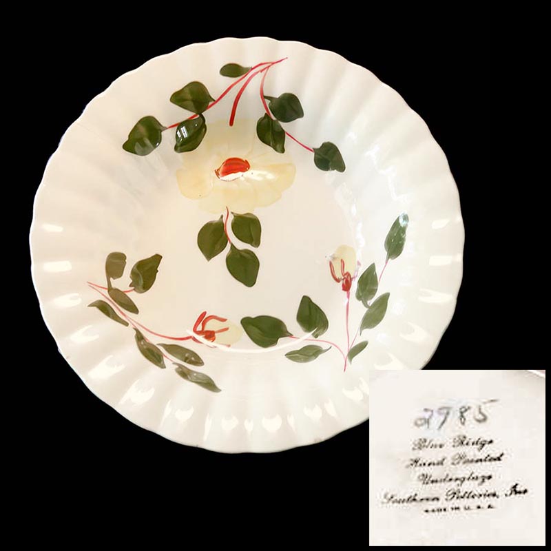 In general, these pattern names are based on the names given in John and Frances Ruffin's three books, Blue Ridge China Today, Blue Ridge China Traditions, and Blue Ridge China Treasures.My intention is to add as many pictures as possible to aid those who don't have access to any of the various Blue Ridge books, but I'll need some help to do it. If you have any pieces of a pattern for which a picture isn't shown, you can help others by sending a picture (a dinner plate works best). Also, if you have a pattern (and number) that is not shown on this page, that information would be greatly appreciated as well.