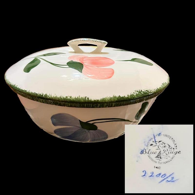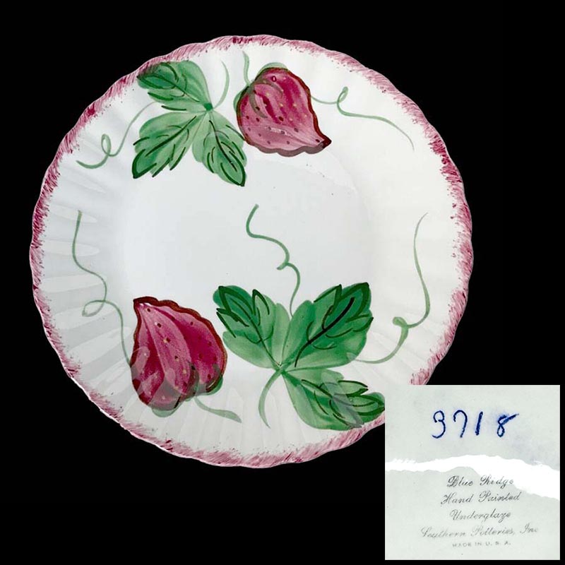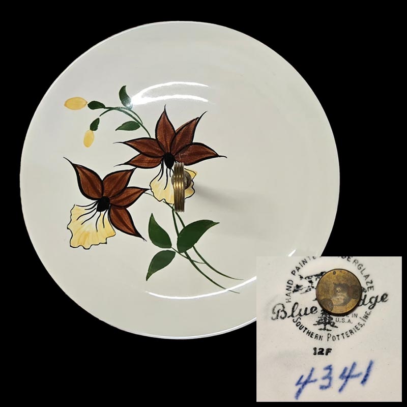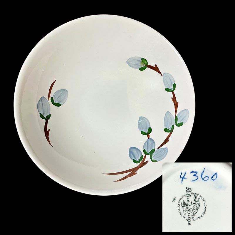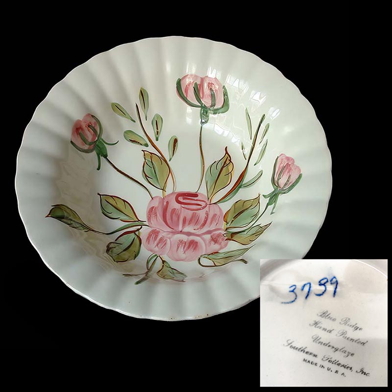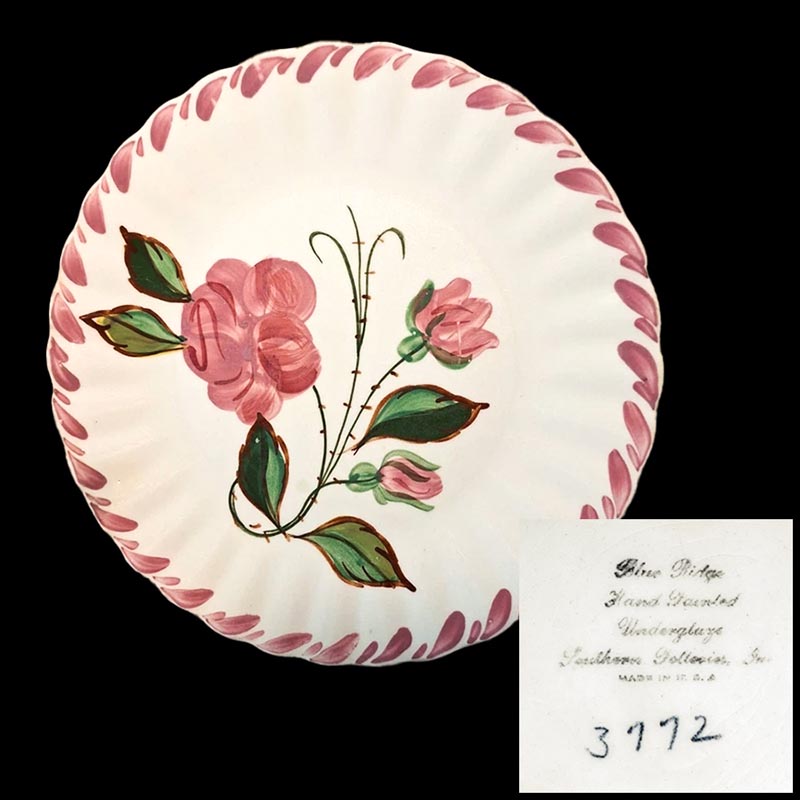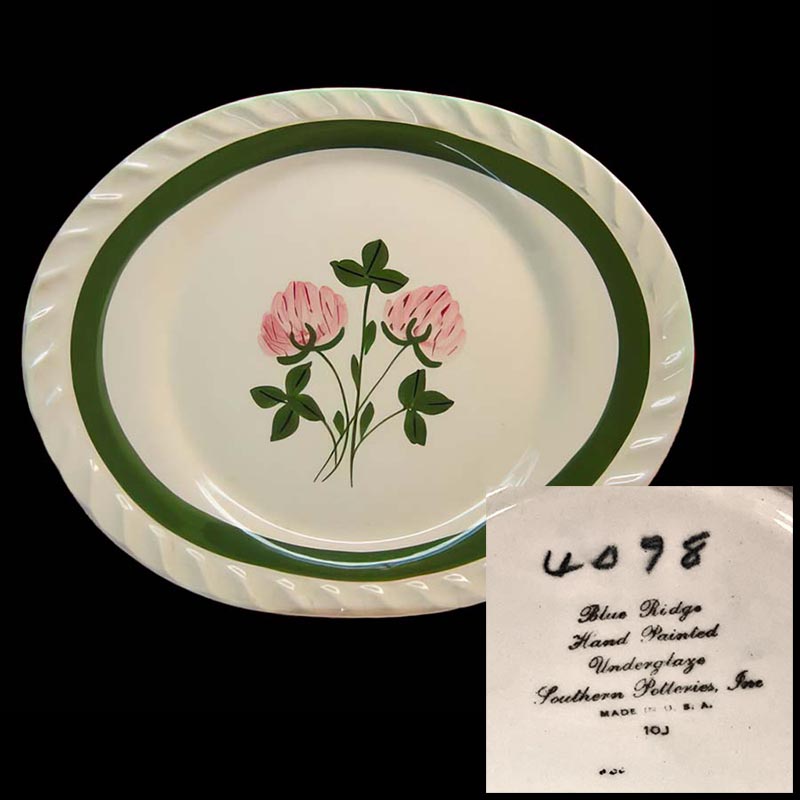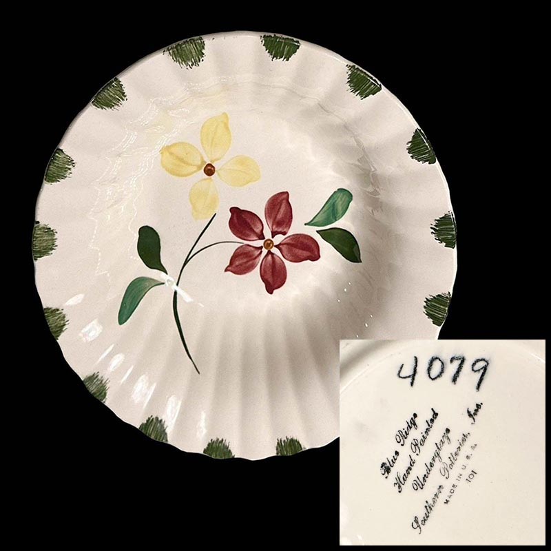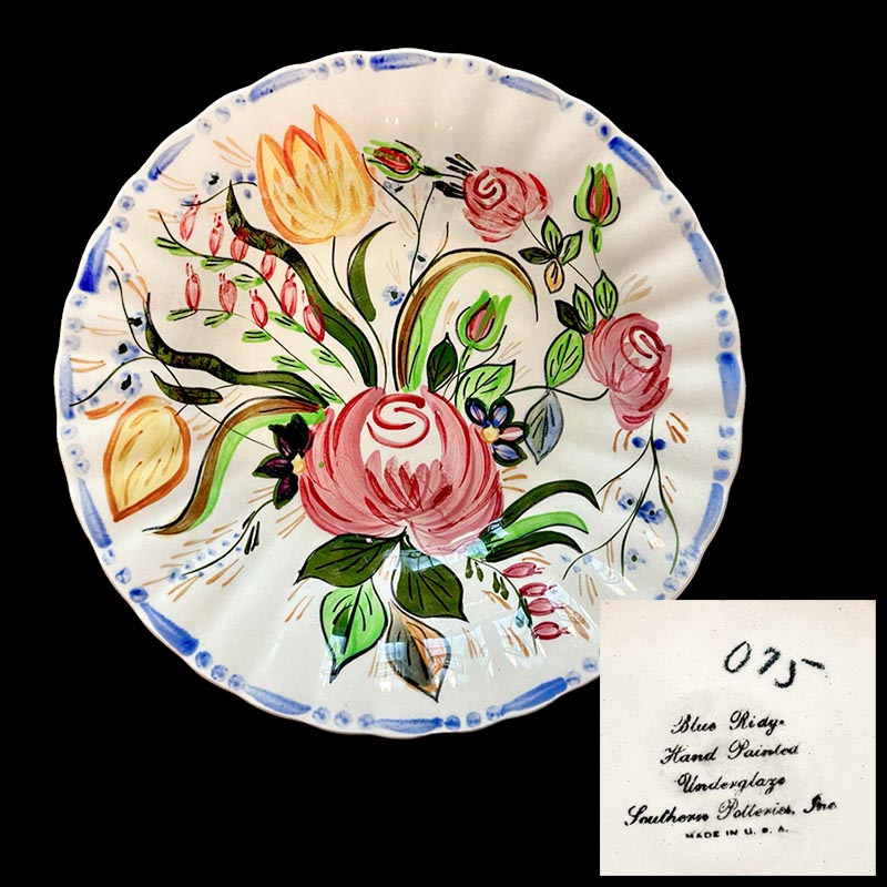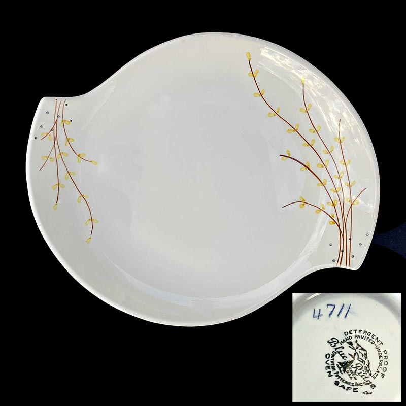 In general, these pattern names are based on the names given in John and Frances Ruffin's three books, Blue Ridge China Today, Blue Ridge China Traditions, and Blue Ridge China Treasures.My intention is to add as many pictures as possible to aid those who don't have access to any of the various Blue Ridge books, but I'll need some help to do it. If you have any pieces of a pattern for which a picture isn't shown, you can help others by sending a picture (a dinner plate works best). Also, if you have a pattern (and number) that is not shown on this page, that information would be greatly appreciated as well.